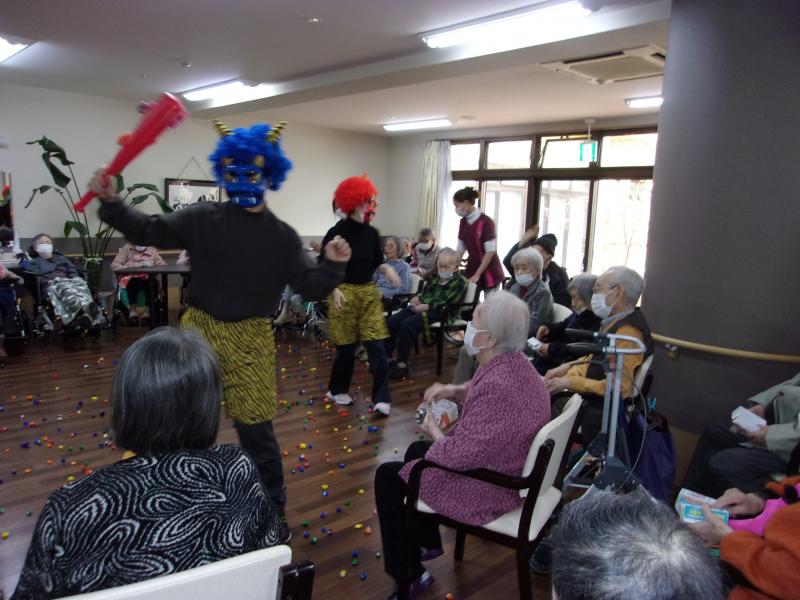 豆まきの後は、床一面に散らばった色紙で作ったカラフルな豆を見て「わぁ〜綺麗だね」と楽しまれ、豆菓子を美味しく頂きました。